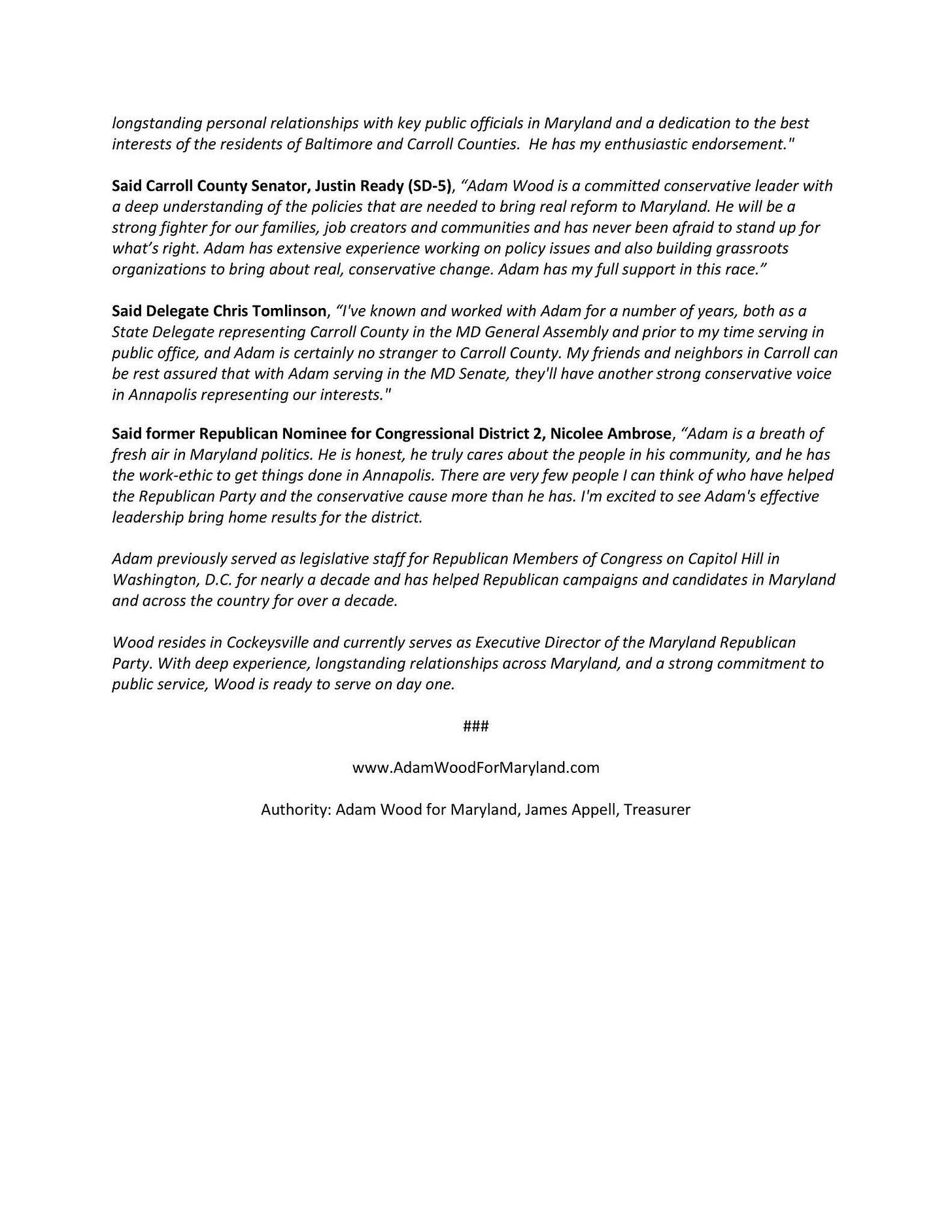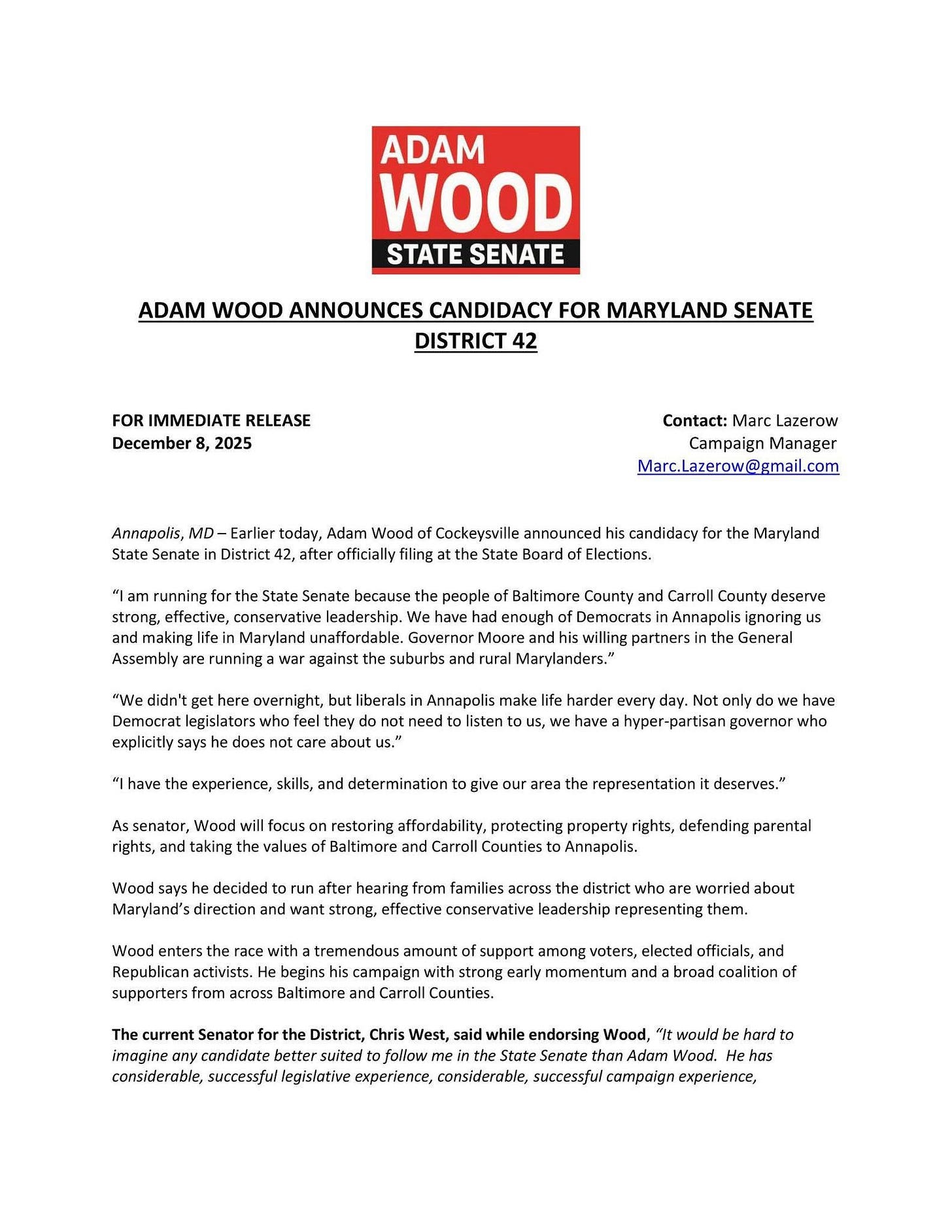 For reasons that defy logic, carpetbagging Maryland GOP Executive Director Adam Wood has announced his candidacy for Maryland State Senate in District 42.