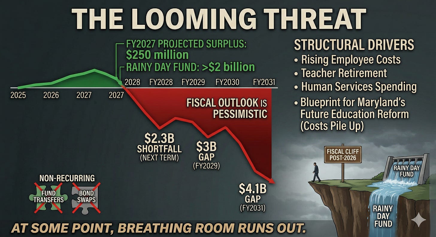 Last week, the Maryland General Assembly sent Governor Wes Moore a nearly $71 billion budget for fiscal year 2027. The budget, as adopted, closes a $1.5 billion projected deficit without raising taxes or fees.1 Democrats celebrated. Republicans (correctly) grumbled. And the Department of Legislative Services quietly noted that the gap waiting on the other side of the 2026 election is larger than the one just closed.