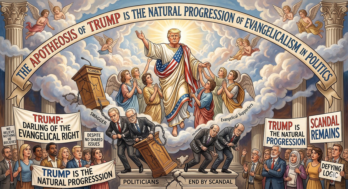 Trump's apotheosis is the natural progression of evangelicalism in politics. Scandal was the end for a preacher like Swagger or Baker, and for politicians like Foley, Craig, and Bauman. But for reasons that defy logic, Trump remains the darling of the evangelical right, despite believing nothing that evangelicals believe in or really promoting issues evangelicals campaign for.