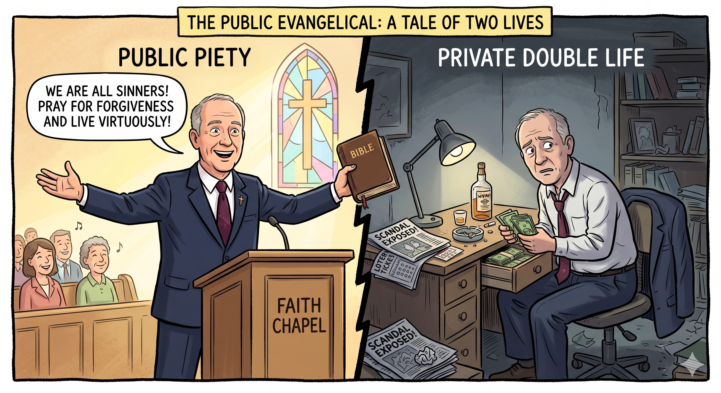The faithful in the evangelical pews deserve better than what they are getting from their religious leaders and political heroes. So does the faith itself. What they're getting instead of religion is a permission structure: powerful men failing in private, being covered for by institutions that share their politics, and returning to the pulpit or the podium with a tearful confession and a fresh fundraising appeal.