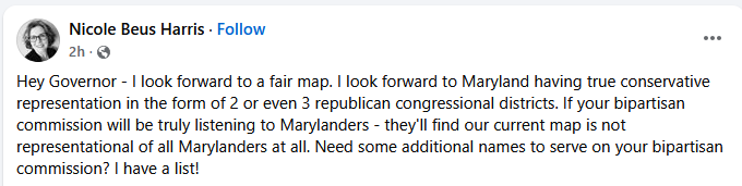 Let me remind you that even the map we have NOW was the result of Democrats in the General Assembly tinkering with the map drawn by Governor Larry Hogan’s bipartisan redistricting commission. A Commission that had NO elected officials serving on it.