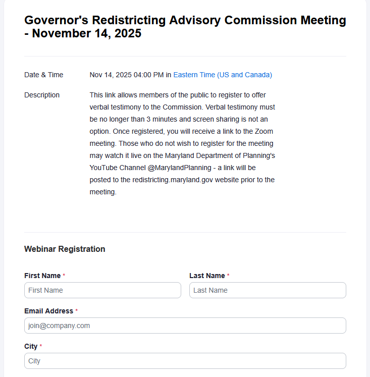 Wes Moore’s Governor’s Redistricting Kangaroo Court Advisory Commission is holding its first hearing this week. And you will never believe when and where it is;