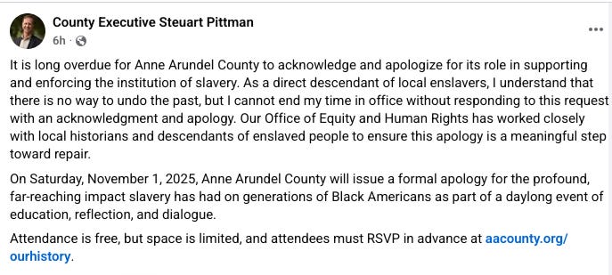 This afternoon, Pittman announced that in four weeks, he would be apologizing on behalf of Anne Arundel County for slavery.