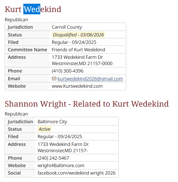 According to the Maryland State Board of Elections, Republican gubernatorial candidate Kurt Wedekind has been disqualified from the race for Governor.