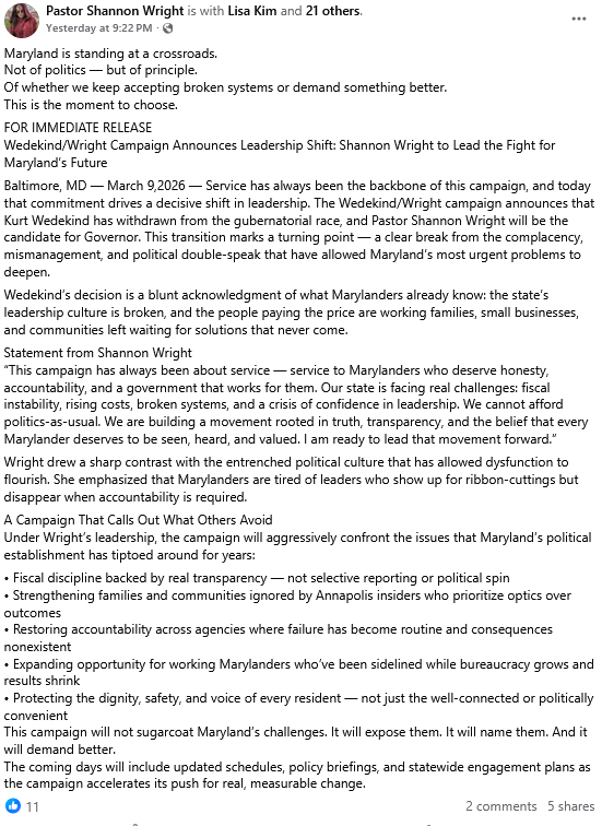 Ultimately, this will have little impact on the Governor’s race. Wedekind and Wright have been practically non-existent on the campaign trail for the last six months. Wedekind’s campaign was a long shot (at best), and his replacement with Wright, a perennial candidate for office in Baltimore and a former candidate in New Jersey, is a step back from even that.