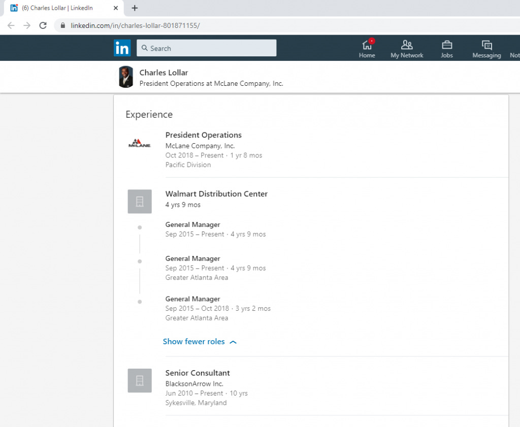 Lollar abandoned his residence in Maryland shortly after losing both elections in 2015, according to one of Lollar’s two LinkedIn profiles. Interestingly, it says that he still has a job as President of McLane Company despite listing Retired Military as his occupation.